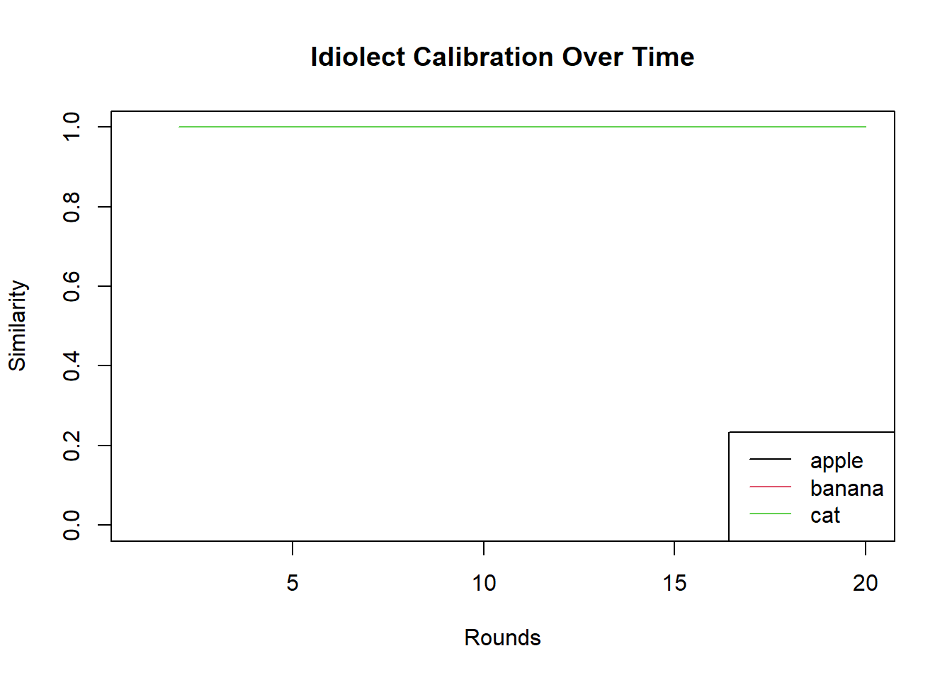 xlab = "Rounds", ylab = "Similarity", main = "Idiolect Calibration Over Time",